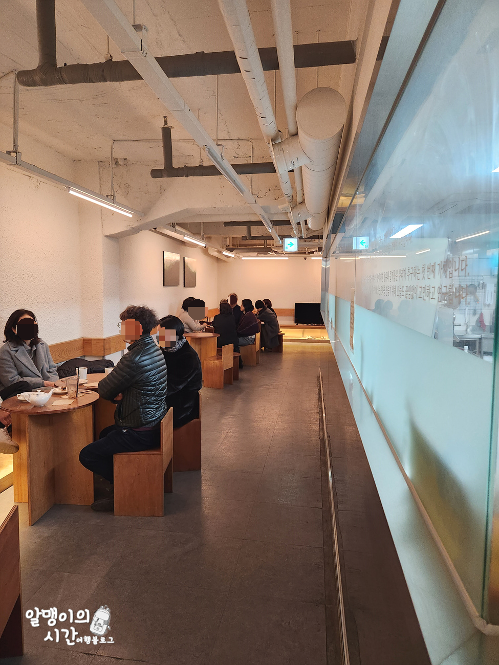 여긴 지하 1층 공간이에요. 지하 공간이 좀더 조용하긴 했는데 지하 1층엔 빵 만드는 공간이 같이 있어서 인테리어 조화가 뭔가 안어울리는 느낌이었음. 주말이어서 1층, 지하 할 것 없이 사람이 많아 자리 선택지는 별로 없었으므로 우린 1층에 자리 잡았어요.