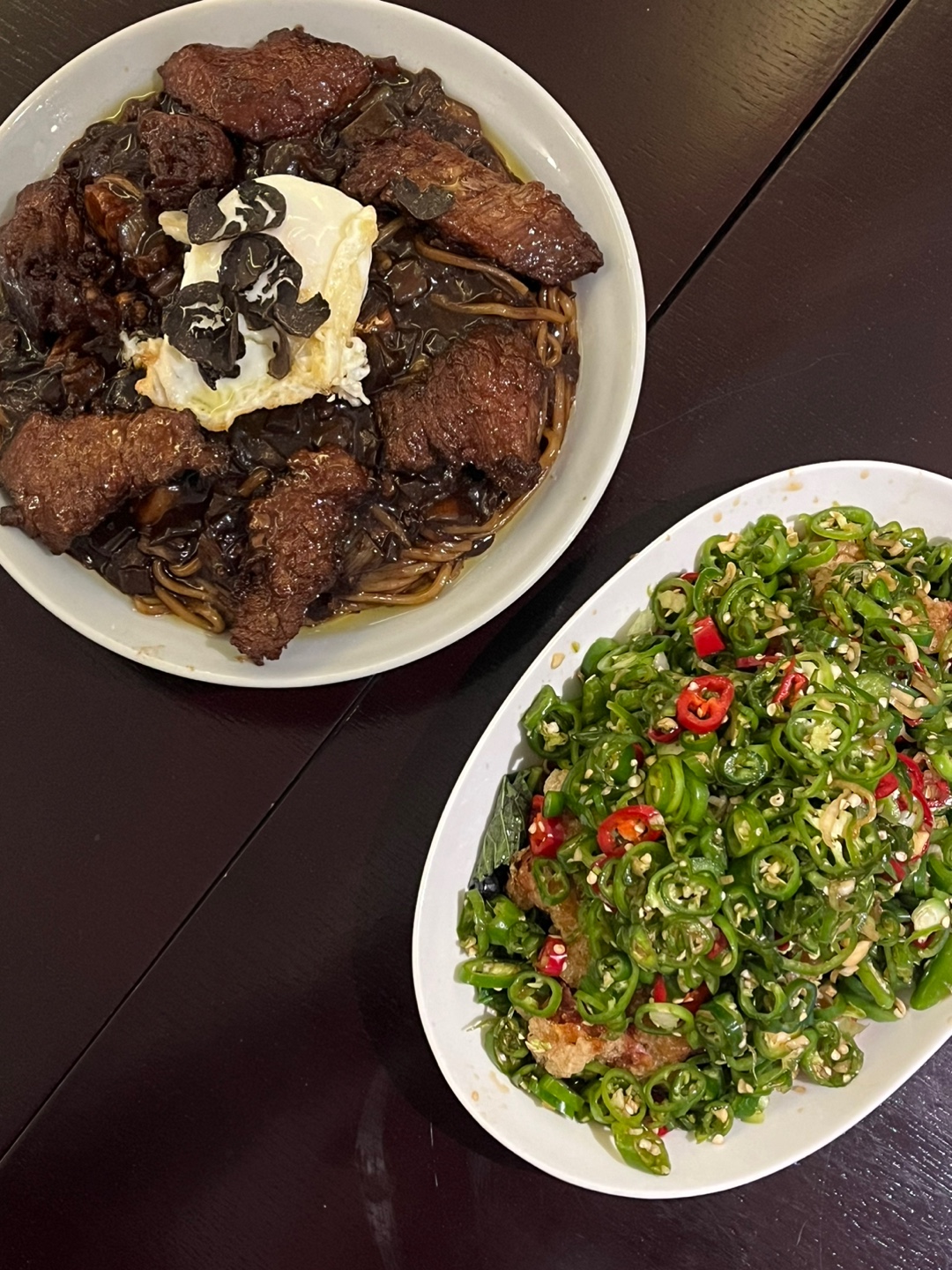 큼직한 스테이크는 함께 주는 가위로 잘라 먹으면 되구요. 트러플 오일까지 한 바퀴 빙 둘러진 짜장면은 향부터가 이미 장난이 아님 ㅠㅠ 두툼 스테이크+트러플 오일+짜장면+노른자톡 조합은 안 먹어봐도 이미 맛있다 ㅠ