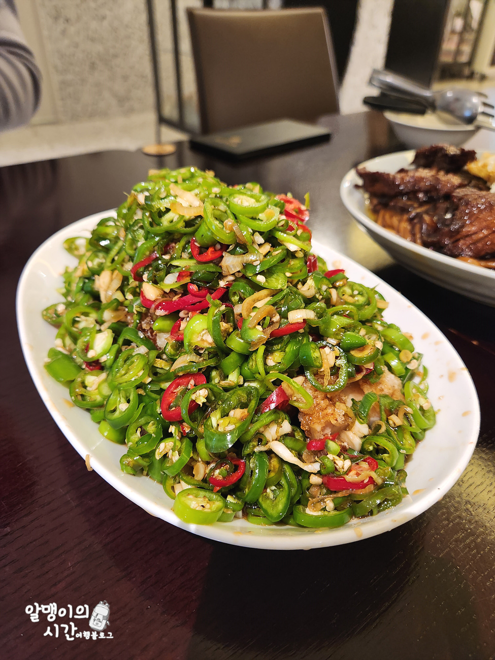 그리고 고추가 수북히 덮여 있는 고추 유린기. 닭튀김은 그 속에 파묻혀서 잘 보이지도 않네요.