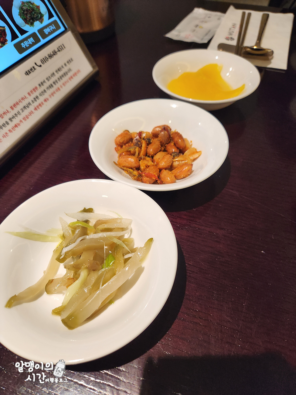 테이블 기본 세팅은 여느 중식당과 비슷. 특이한 점은 자차이가 빨갛지 않고 하얗게 나오는데 은근 중독성 있는 맛이라 오독오독 먹기 좋았음.