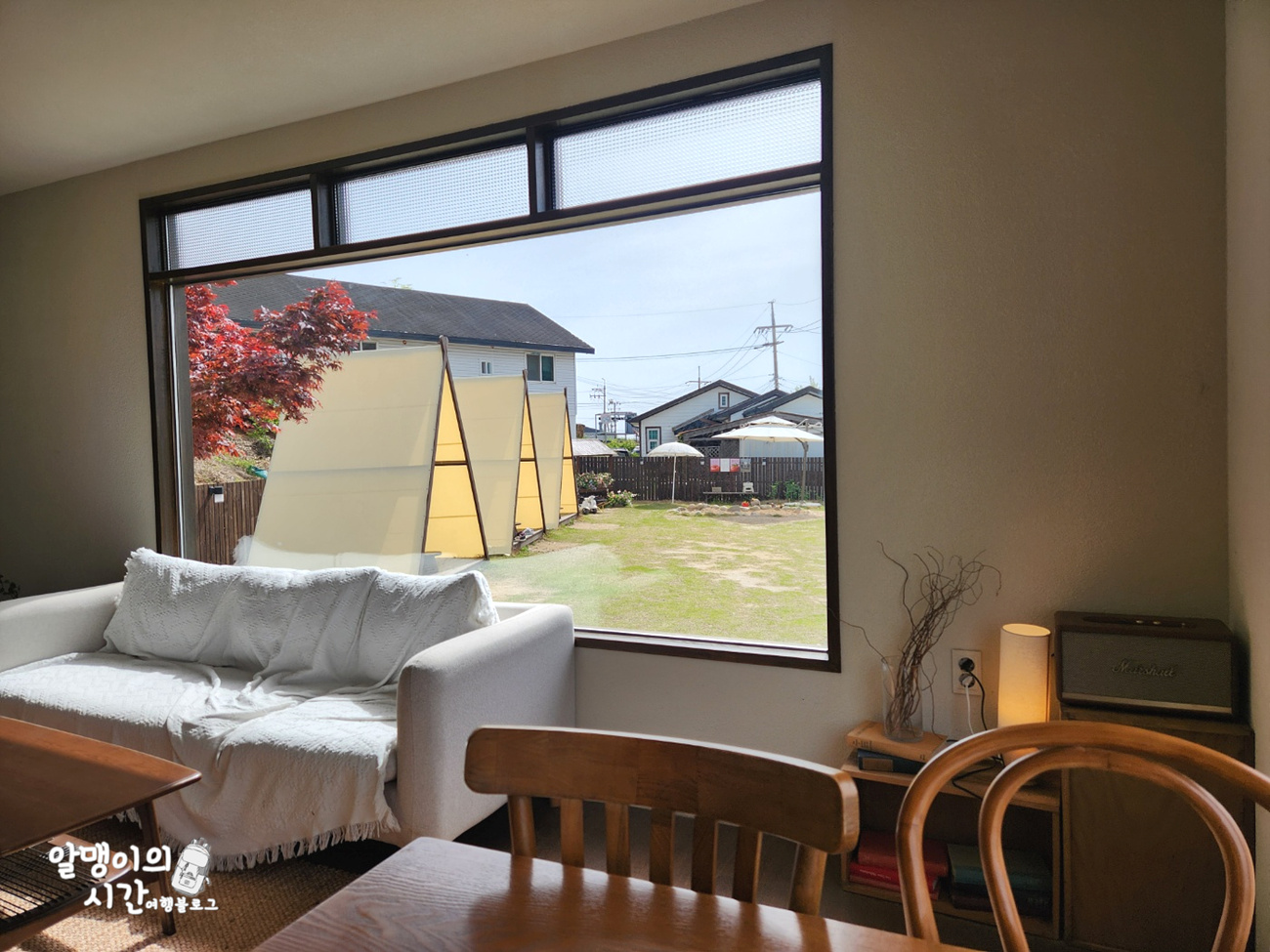 야외 공간은 이렇게 아늑한 텐트형 자리, 일반적인 파라솔 테이블 자리가 있었는데 저 텐트형 자리 탐나더라구요. 근데 이날은 조금 덥기도 해서 에어컨 나오는 실내에 자리 잡았어요.