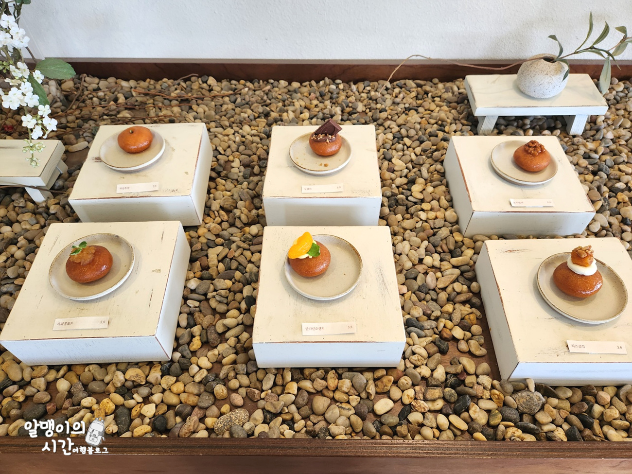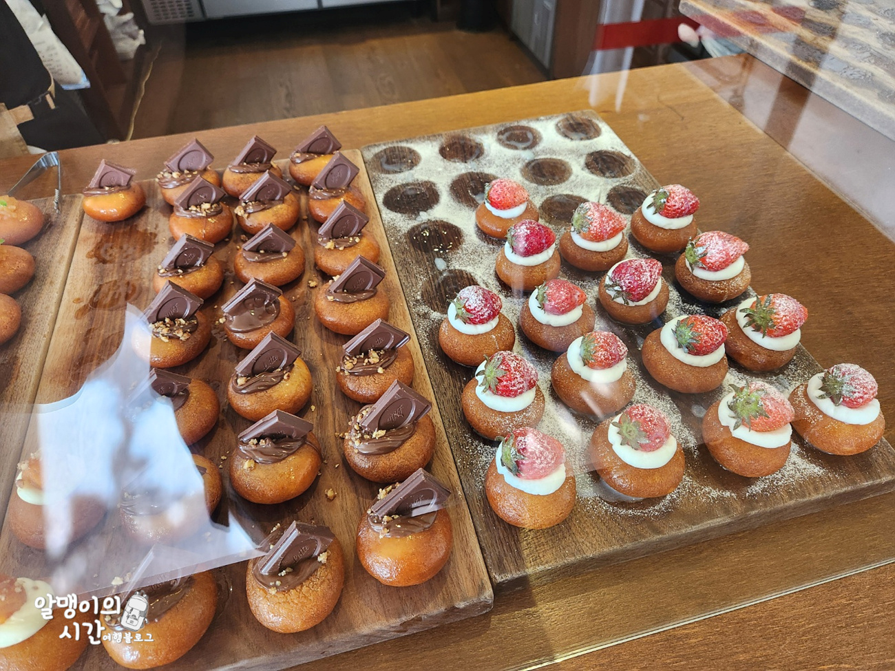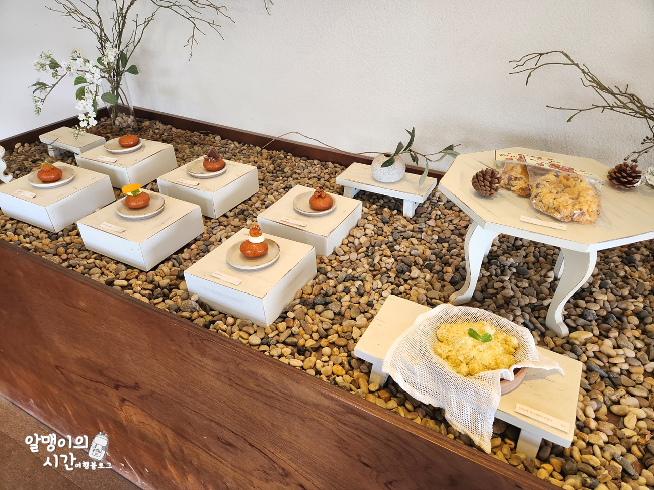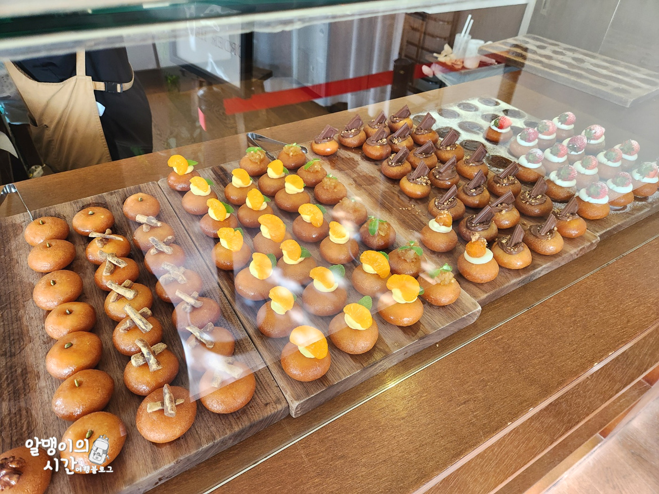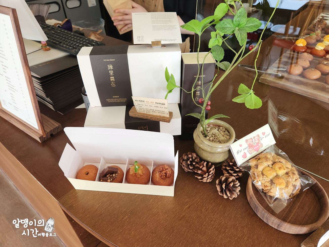 카운터 근처에 오늘 파는 개성주악 라인업 및 디저트 메뉴들이 전시되어 있어 주문 전 미리 살펴보고 고를 수 있어요.