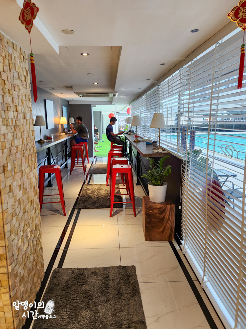근데 서양인들은 여기보단 수영장 앞에 있는 야외 테이블을 더 좋아하더라구요 ㅎㅎ 야외 테이블까지 합하면 자유롭게 쉴 수 있는 테이블이 꽤 있었어요.