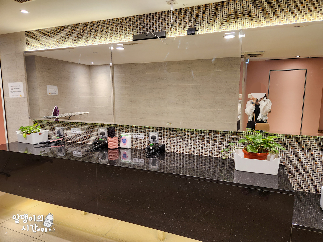 화장할 수 있는 공간, 드라이기, 빗, 고데기, 면봉 같은 것들도 구비되어 있었어요. 저도 아침마다 여기서 머리말리고 화장하고 나갔 ㅎㅎ