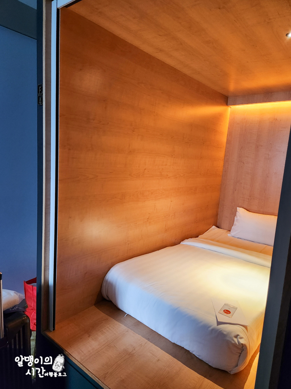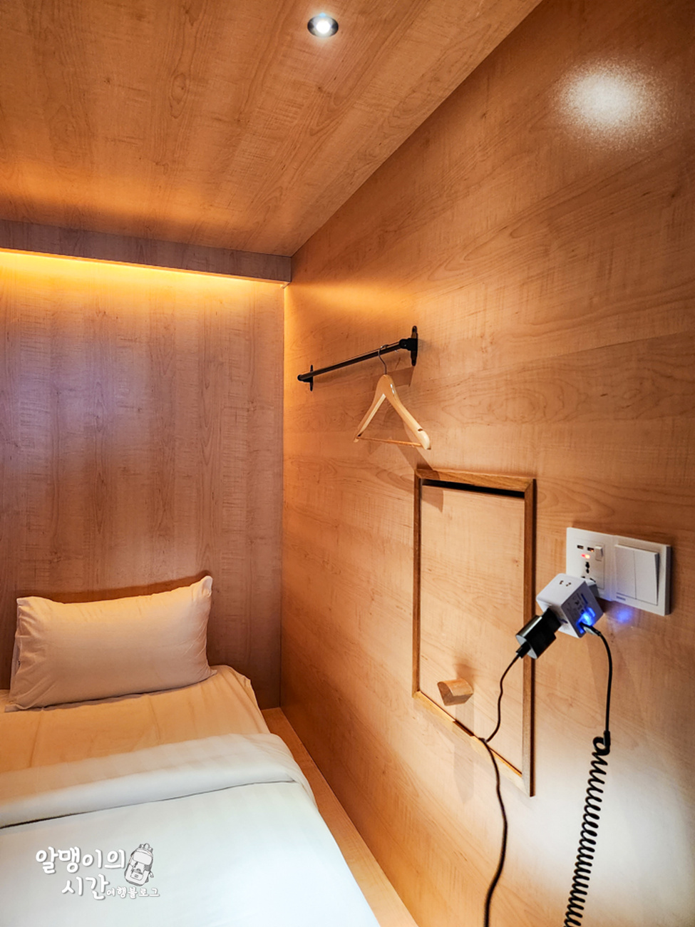 저는 좀 더 큰 프리미엄 싱글 캡슐(정면 출입)로 예약해서 캡슐형이지만 공간이 이만큼 커요. 높이는 안에 들어가서 서 있어도 되는 정도? (키 163)
