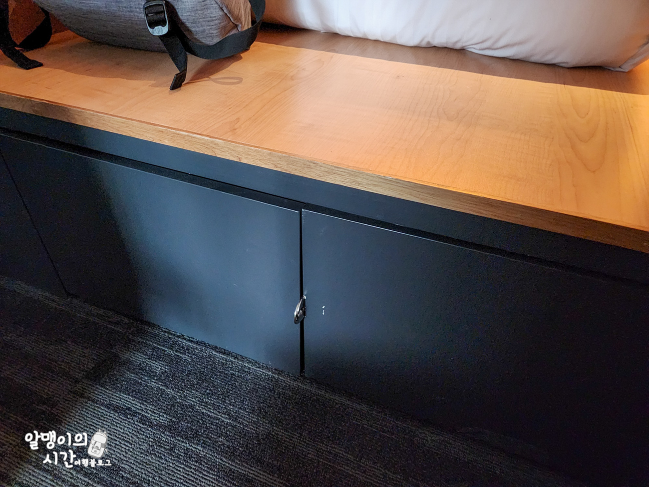 그리고 침대 바로 아래에 25인치 캐리어가 들어가는 큰 사물함이 있어 짐 넣어놓고 다니기도 좋았어요. 캐리어 편 상태로도 들어갈 정도 크기라 저는 캐리어 펴서 고대로 넣어두고 서랍처럼 꺼내쓰곤 했어요.
