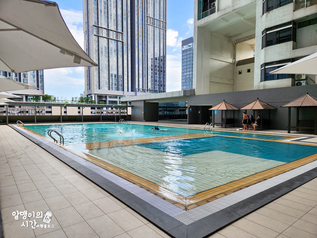 공용공간 옆 유리문을 열고 나가면 숙박객 누구나 자유롭게 쓸 수 있는 큰 수영장이 나와요. 수영장엔 수심 낮은 어린이용 구역도 있어 애기들도 많이 놀고 있더라구요.