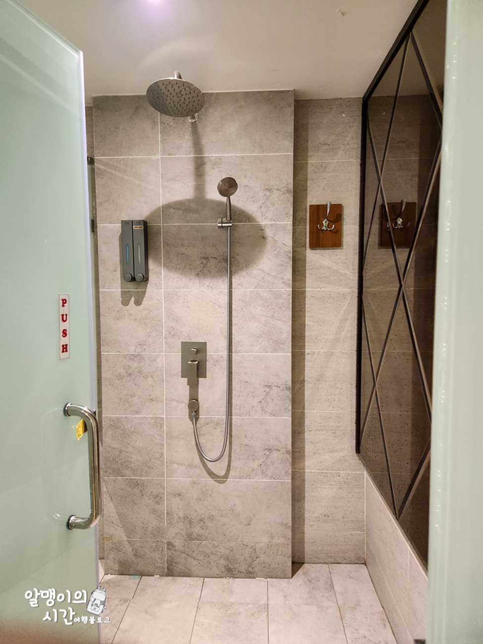 샤워실은 개별 부스로 되어 있고 안쪽엔 옷 걸 수 있는 공간 및 샴푸, 바디워시가 있었어요. 샤워기가 고정식이 아니어서 좋았음.