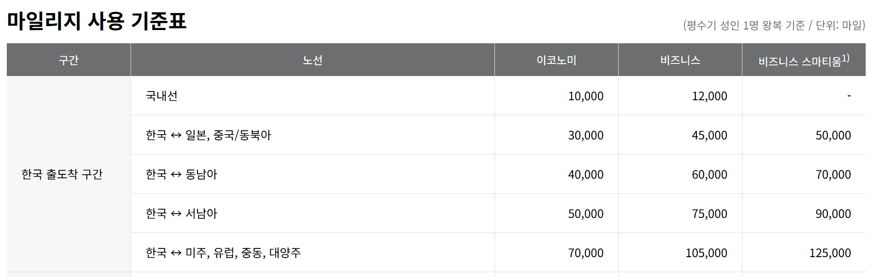 그럼 궁금하실 마일리지 공제표(사용 기준표)도 알아볼게요. 아래 공제표는 성인 평수기 왕복기준입니다. 출도착지는 우리나라구요.