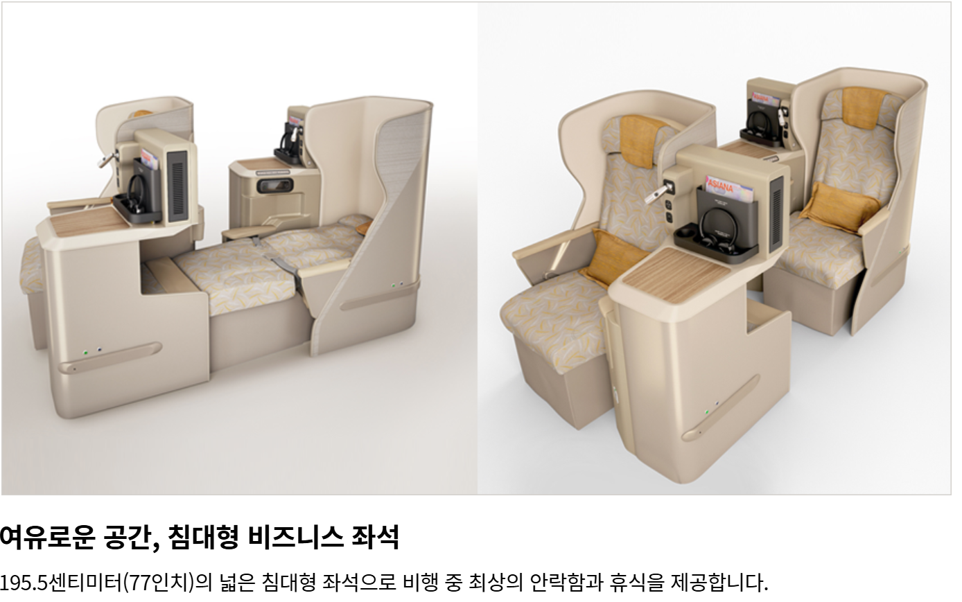 -'비즈니스'와 비교해서 좌석 너비 및 앞뒤 간격이 더 넓고, 좌석을 펴면 180도 풀플랫+수평이됨