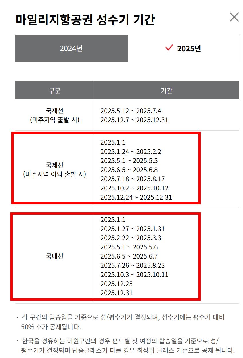 국제선 한국 출도착의 경우 위에서 [국제선(미주지역 이외 출발시)]를 보시면 됩니다. 우리나라 연말, 연초나 징검다리 연휴 기간, 명절 연휴기간, 여름 휴가철 등이 성수기로 지정되어 있네요.
