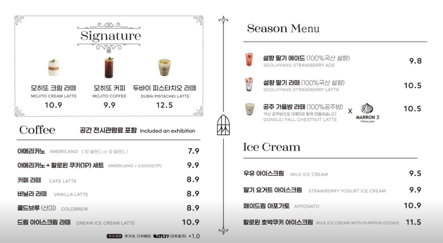 메뉴는 네이버 지도에서 가지고 왔는데, 보다시피 가격대가 사악한데, 공간 전시관람료가 포함되어 그렇다고 하네요. 요즘 대형 카페들은 다 관람료 명목으로 음료값을 높여 받는 경우가 많아 놀랍지는 않지만