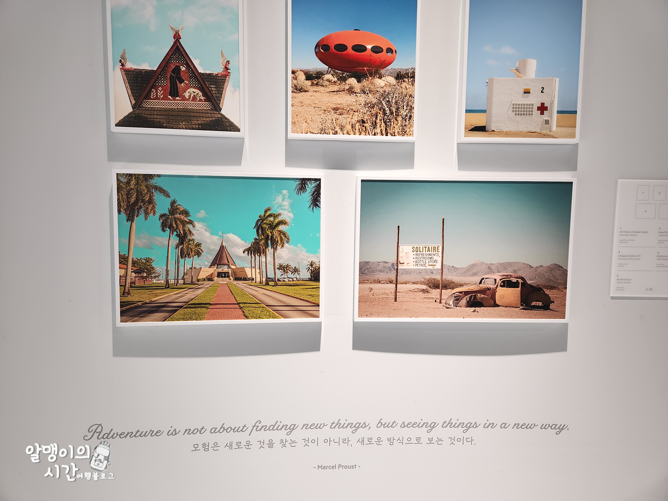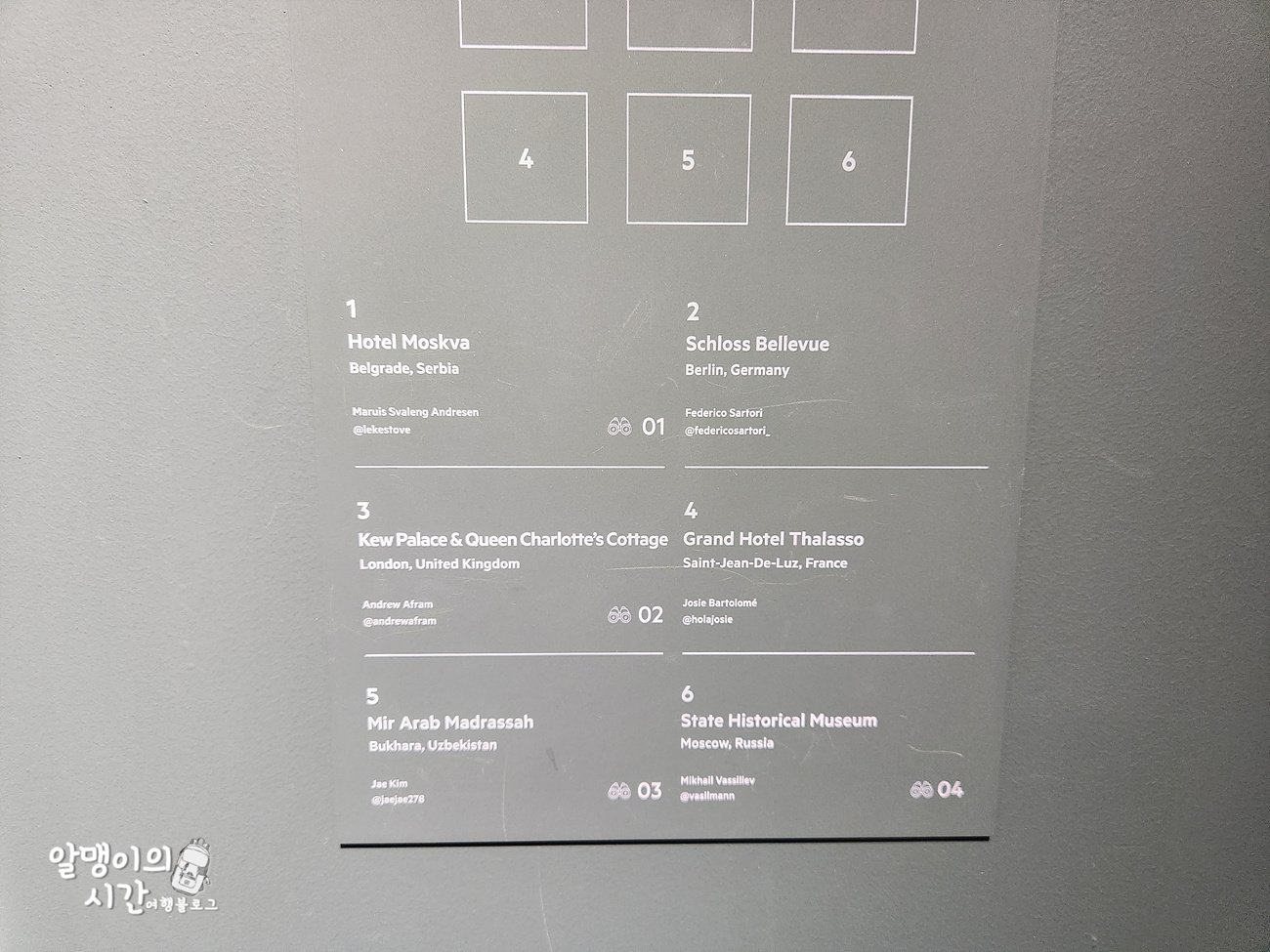 그래서 작품 옆에는 그 사진을 찍은 장소, 국가와 도시 이름, 촬영자의 이름 및 인스타 계정이 써 있어요. 그래서 저는 보다가 마음에 드는 사진이 있으면 설명 부분을 촬영했어요.