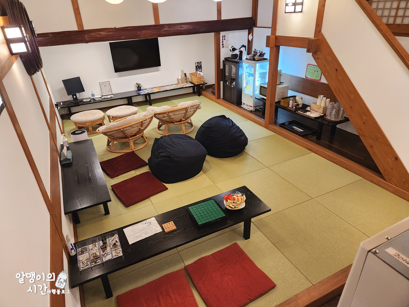 숙박객들이 와서 자유롭게 쉬었다 갈 수 있는 공용공간이 있더라구요. 공용공간에 있는 커피, 차 주스나, 물을 무료로 가져다 마실 수 있고, 작은 간식거리도 있어요. 전자렌지, 전기포트도 있고, 비치된 책이나 여행 정보 책자 등도 열람할 수 있어요.