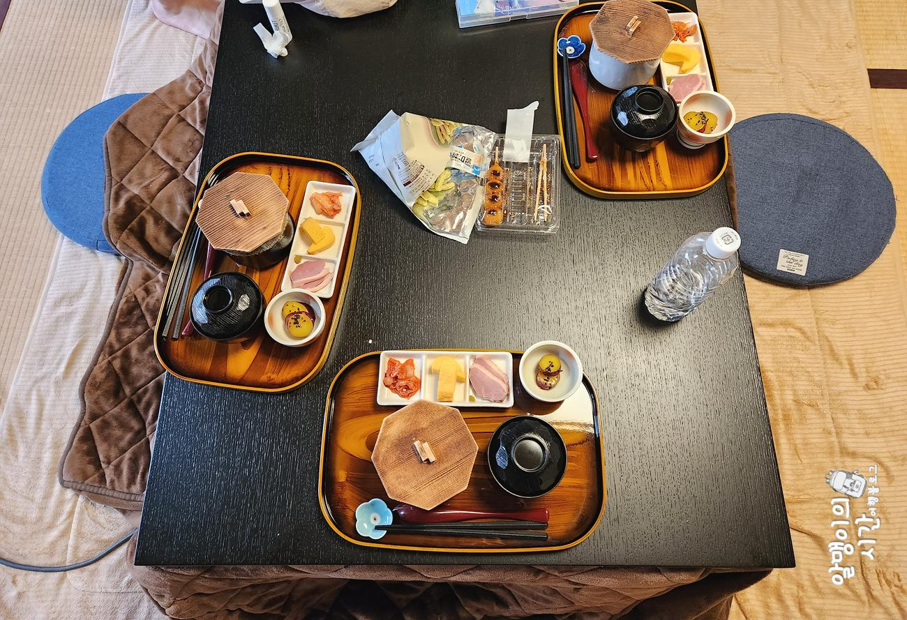 온천하고 유카타 걸쳐 입은채 노곤노곤한 상태로 올라와 코타츠 온도 넉넉히 올려두고 편의점에서 사온 야식 까먹으니 완전 극락ㅠㅠ 이 맛에 료칸에서 숙박하나보다 했네요.