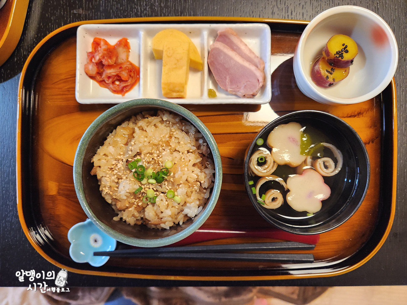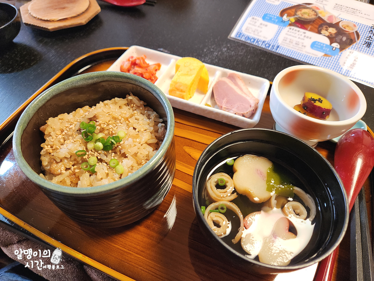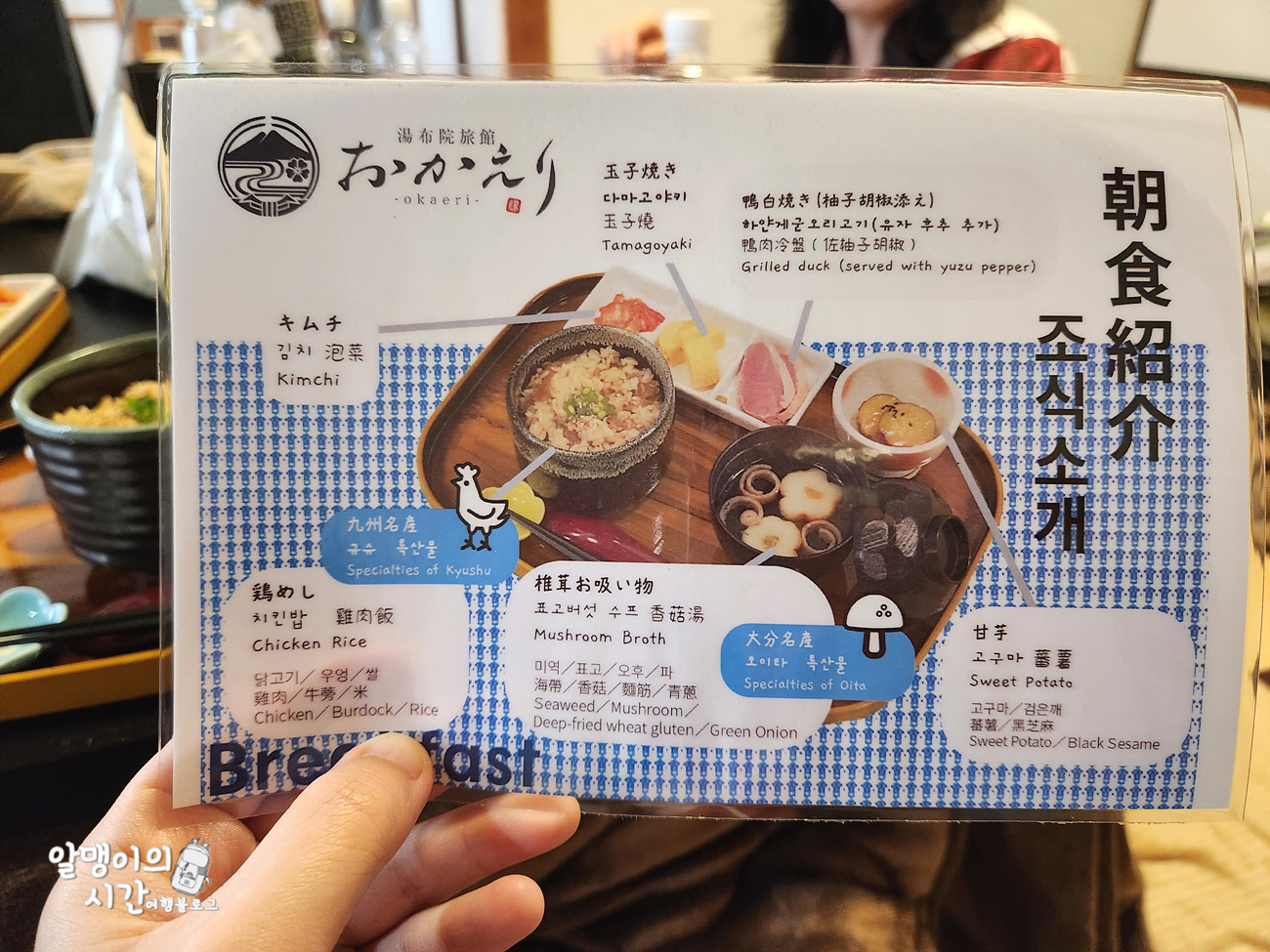 메뉴에 대한 설명이 적힌 한국어 설명서를 같이 줘서 배려 받는 기분이 들더라구요. 제가 갔을 때는 치킨밥, 표고버섯 스프, 꿀 고구마, 김치, 다마고야키, 오리고기가 나왔는데 담백하면서도 조화로운게 조식으로 먹기 딱이었어요.
