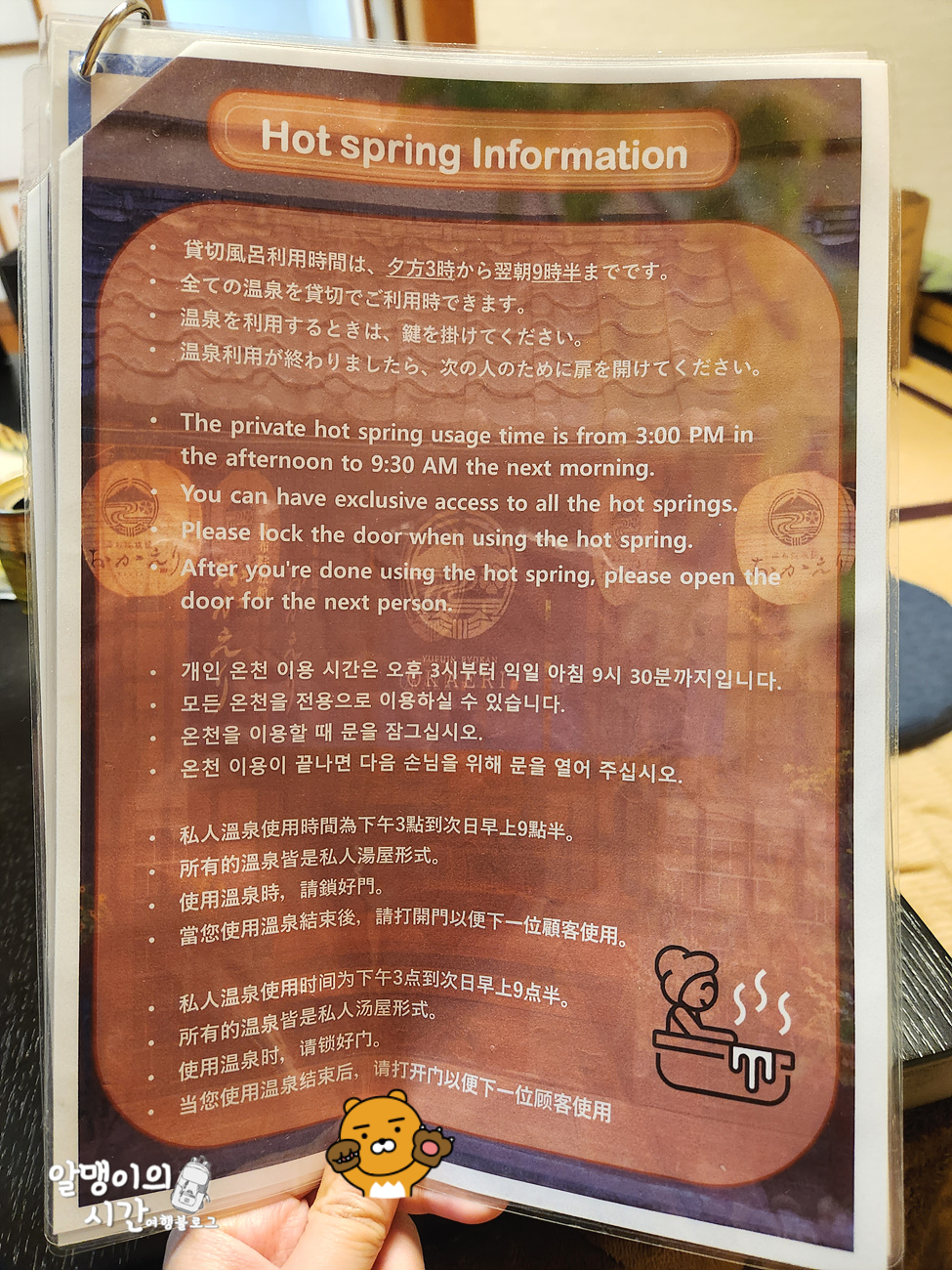 노천탕은 인기가 많아 갈 때 마다 누군가가 사용중인 경우가 많았는데, 다행히 다음 날 체크아웃 하기 전 아침 일찍 가서 이용할 수 있었어요. 노천탕 꼭 이용해보세요 ㅎㅎ 온천 이용 안내는 체크인할 때 직원분이 자세하게 알려주십니당