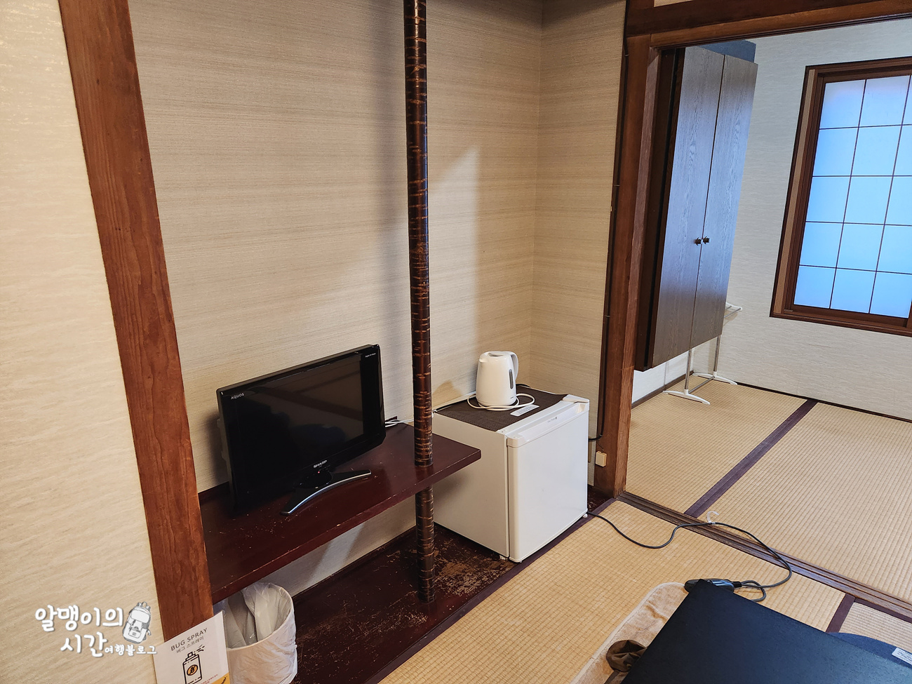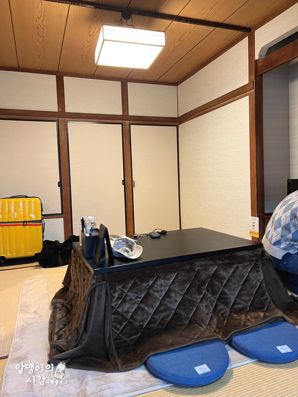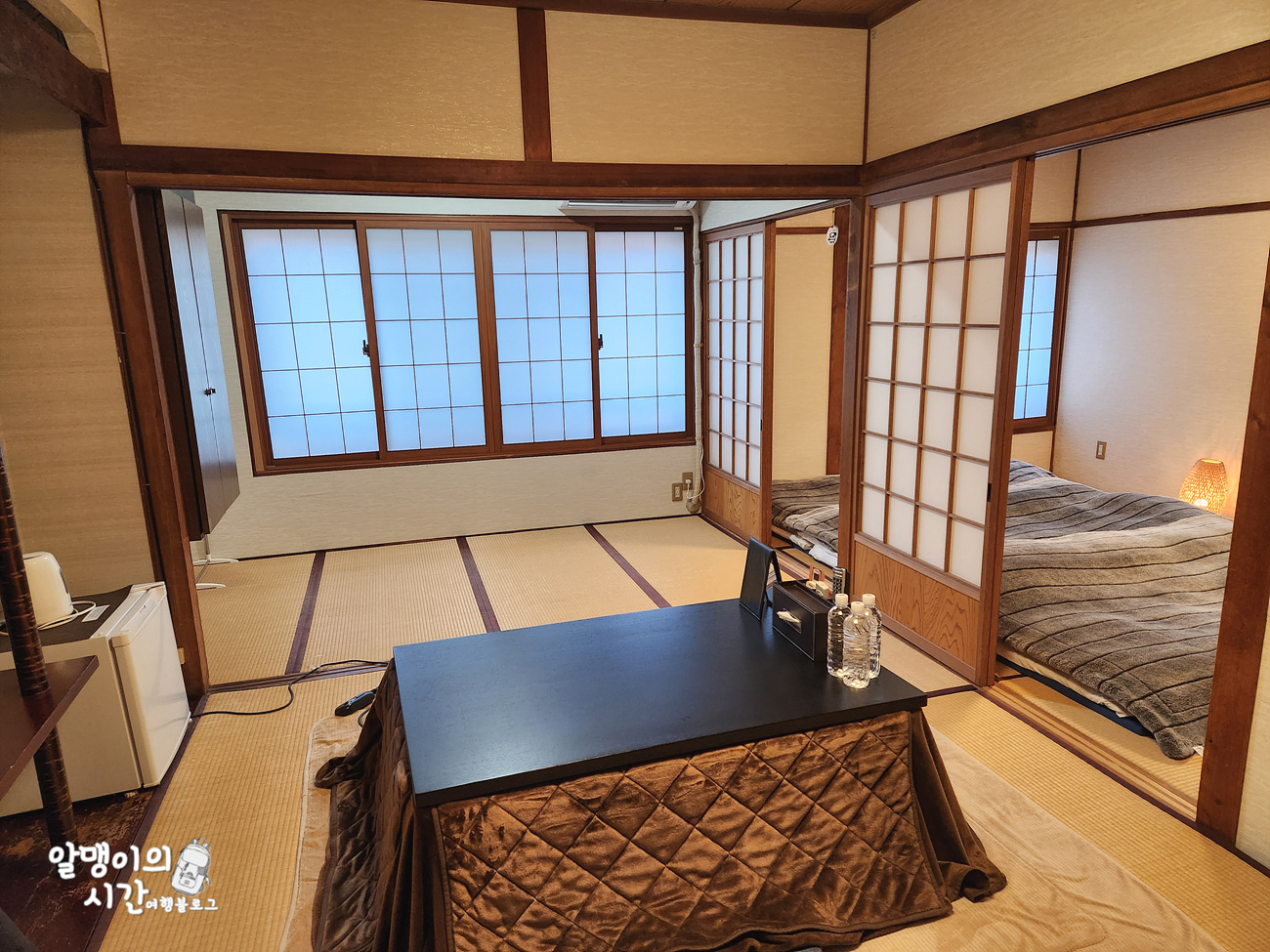 코타츠가 있는 다다미방. 딱 제가 일본 숙소 하면 생각하는 그런 전통적인 모습이라 좋았고, 미닫이 문으로 침실과 거실이 분리되어 있어 좋았어요.