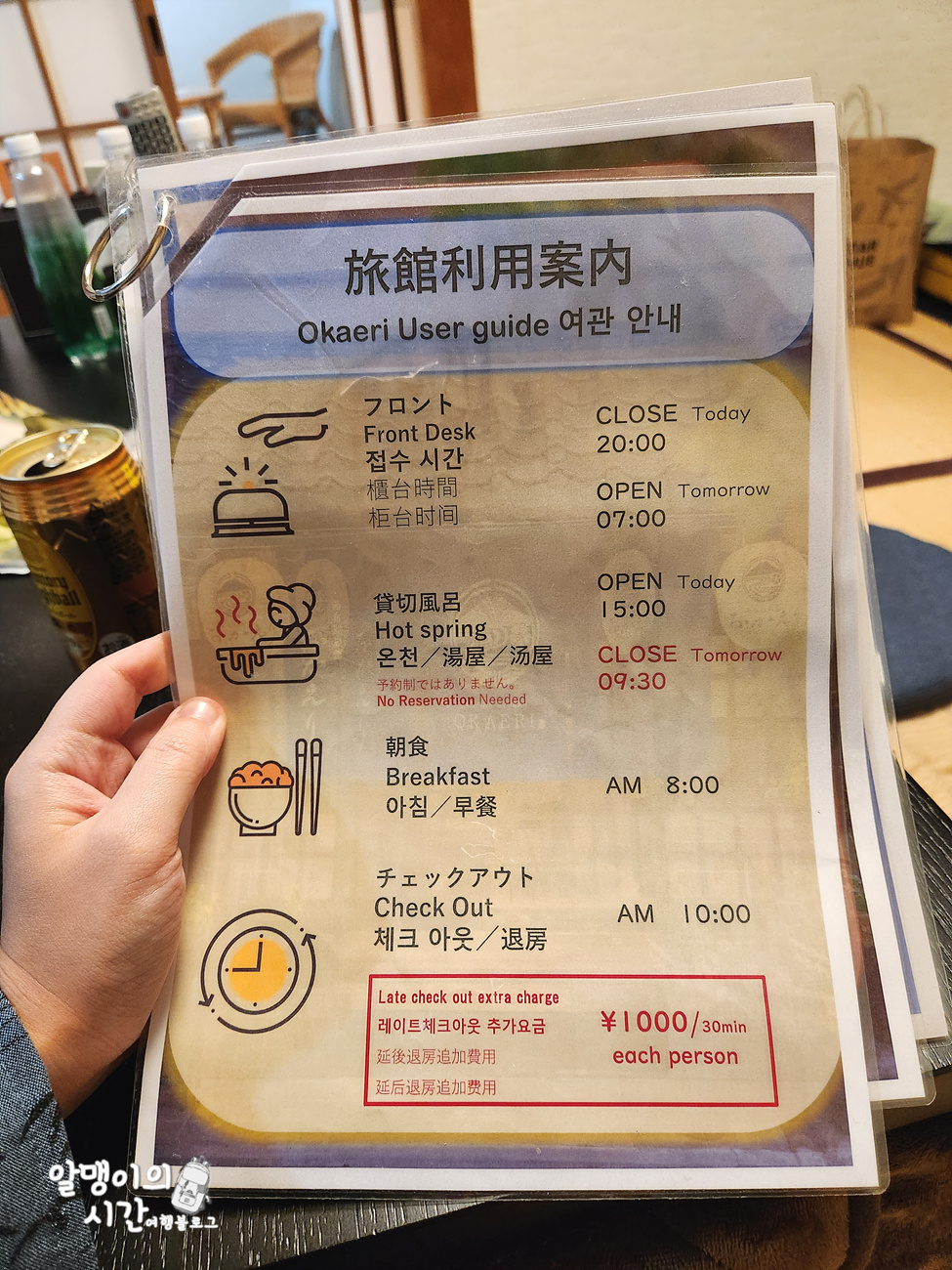 온천은 매일 오후 3시부터 다음 날 아침 9시 30분까지 이용하실 수 있으니 참고하세요! 조식 시간은 아침 8시, 체크 아웃은 오전 10시까지입니다.