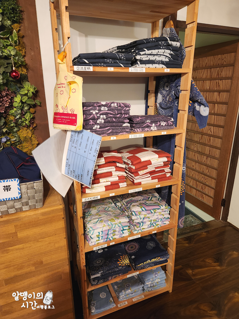 1층 프론트 앞 쪽엔 유카타가 사이즈, 성별에 따라 다양한 사이즈로 준비되어 있어서 자유롭게 가져다 입으면 됩니다. 유카타 위에 입는 하오리도 있었어요.