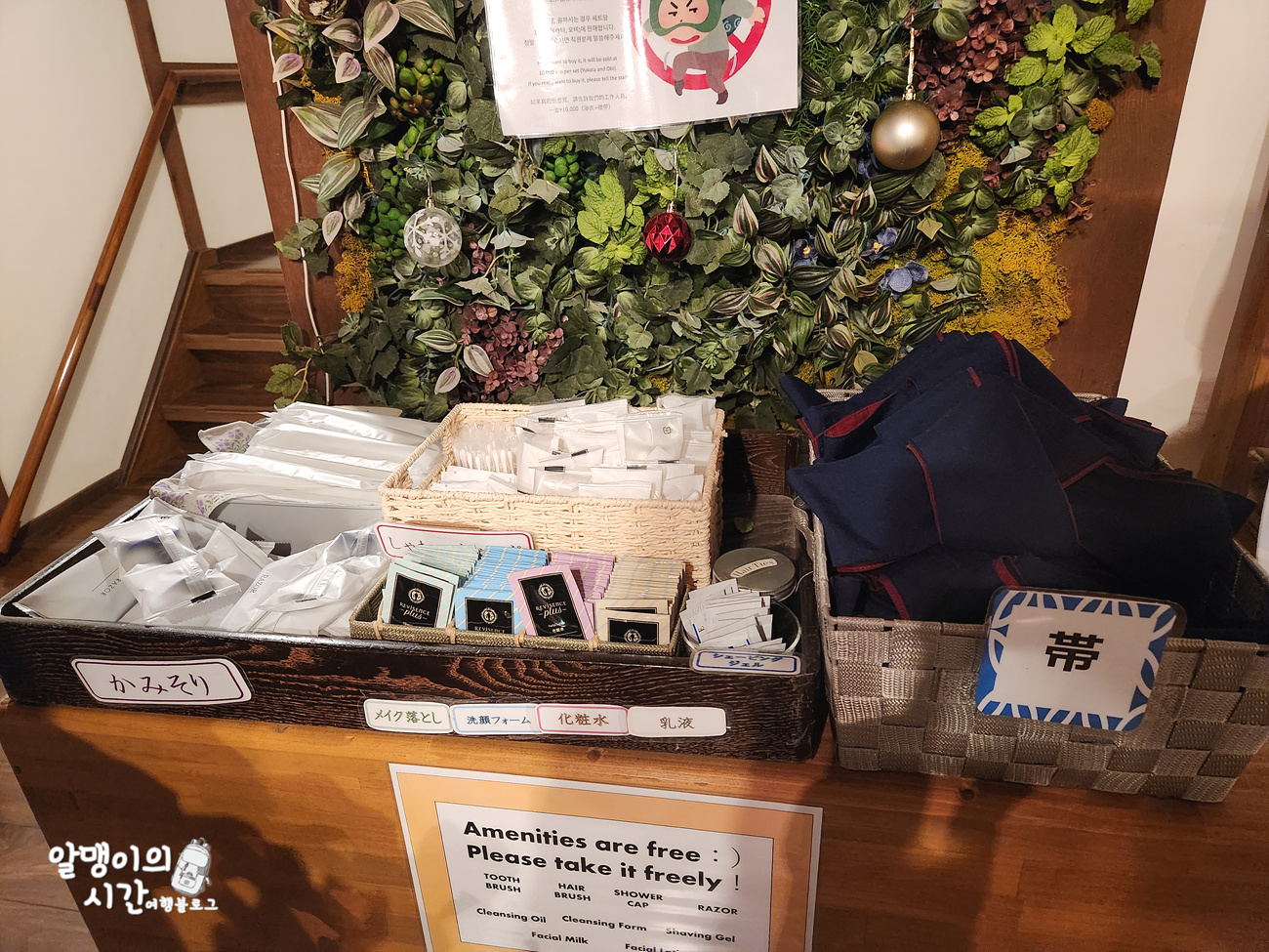 뿐만 아니라 클렌징폼, 클렌징 오일, 로션, 밀크, 쉐이빙 젤, 샤워캡, 면봉, 일회용 칫솔과 치약, 일회용 면도기, 일회용 빗 등이 있어 필요한 만큼 알아서 가져다 쓰시면 됩니당