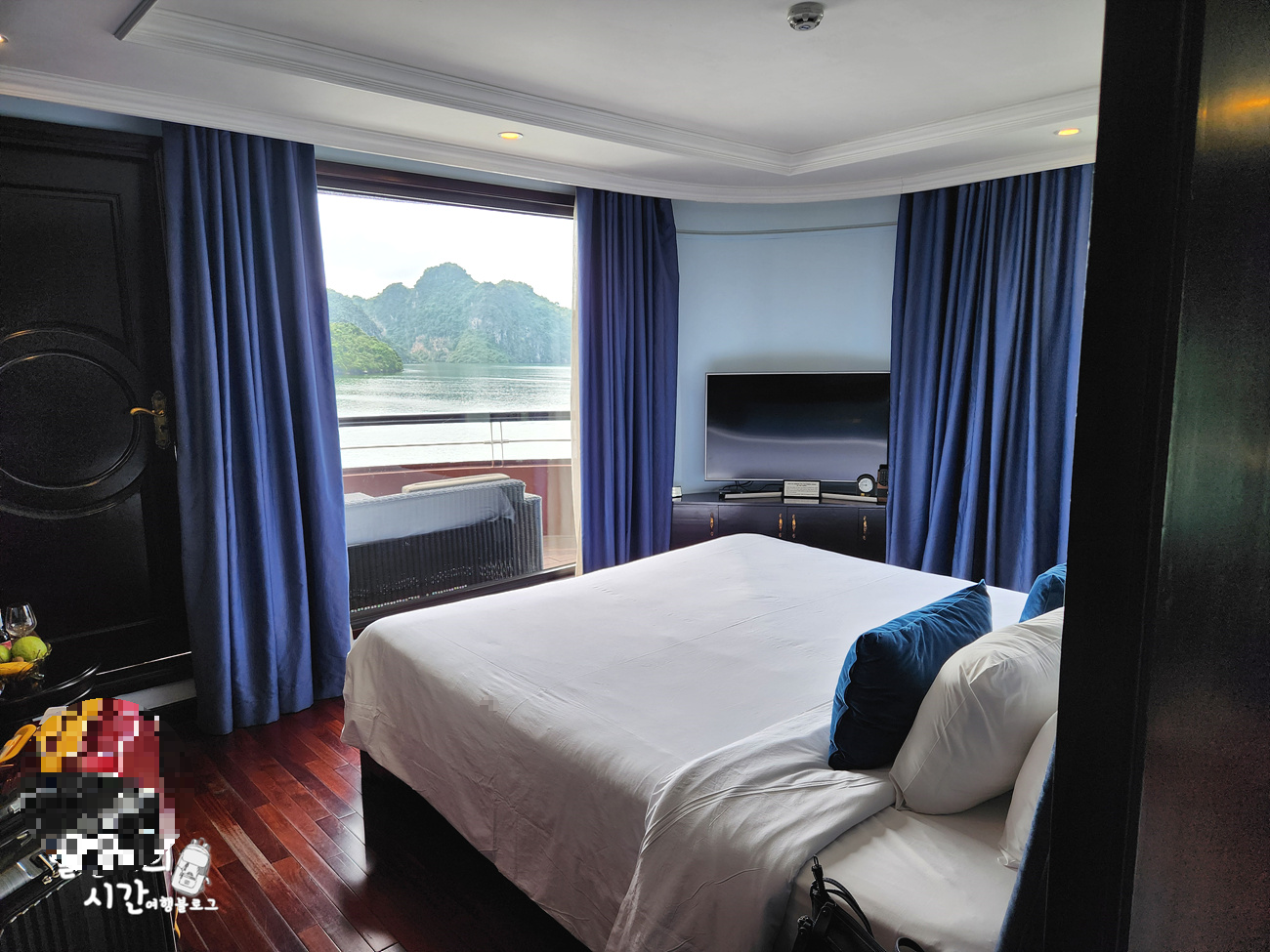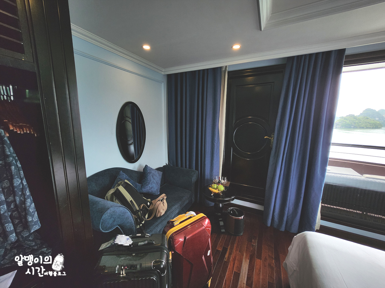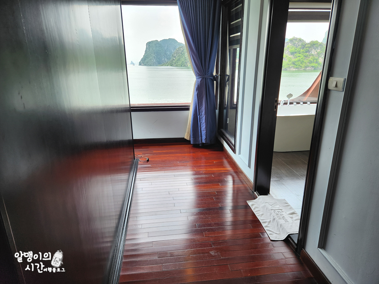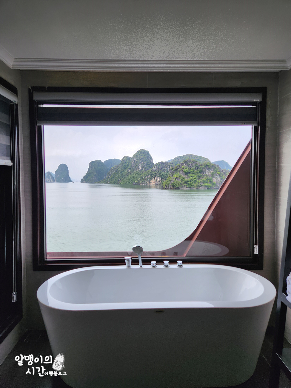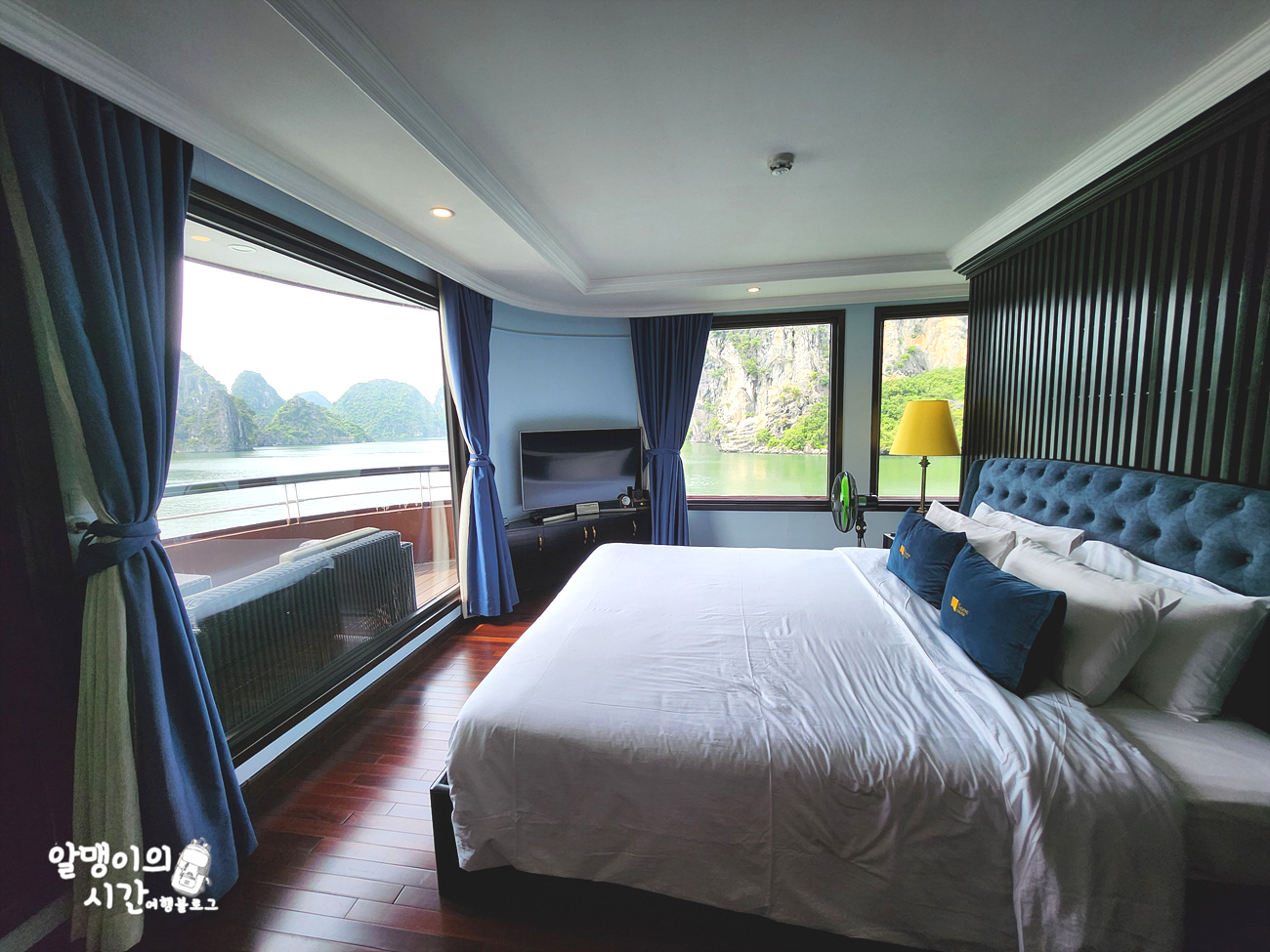 침대에 누우면 발 밑으로도 하롱베이가 보이고, 옆으로 돌아누워도 하롱베이가 보이는 시원한 창! 보통의 객실은 한 면에만 창문이 있는데 우리 객실은 두 면이 창문이라 더 시원시원하고 좋았어요.
