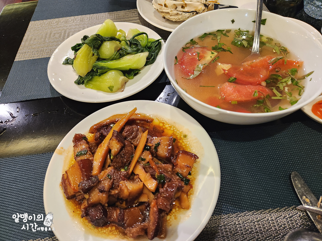 청경채 볶음과 토마토 해산물 스프, 돼지고기 삼겹살 조림은 무난무난하게 잘 먹었어요. 저는 해산물 구이보단 돼지고기 삼겹살이 좀 더 맛있었어요.
