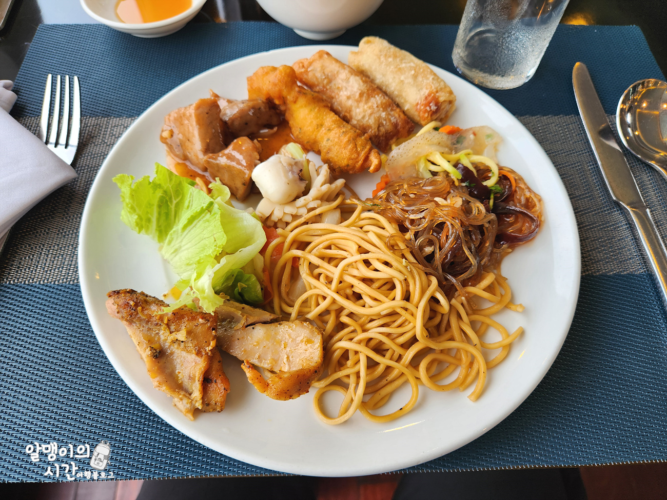 튀긴 꽃빵, 볶음 국수, 잡채랑 비슷했던 면요리, 스프링롤이 맛있어서 몇 번 리필해먹었어요. 음료의 경우 물은 무료인데, 탄산음료나 주류는 유료입니다. 그래봤자 맥주 하나 3~4000원 정도여서 부담 없이 시켜마셨어요.