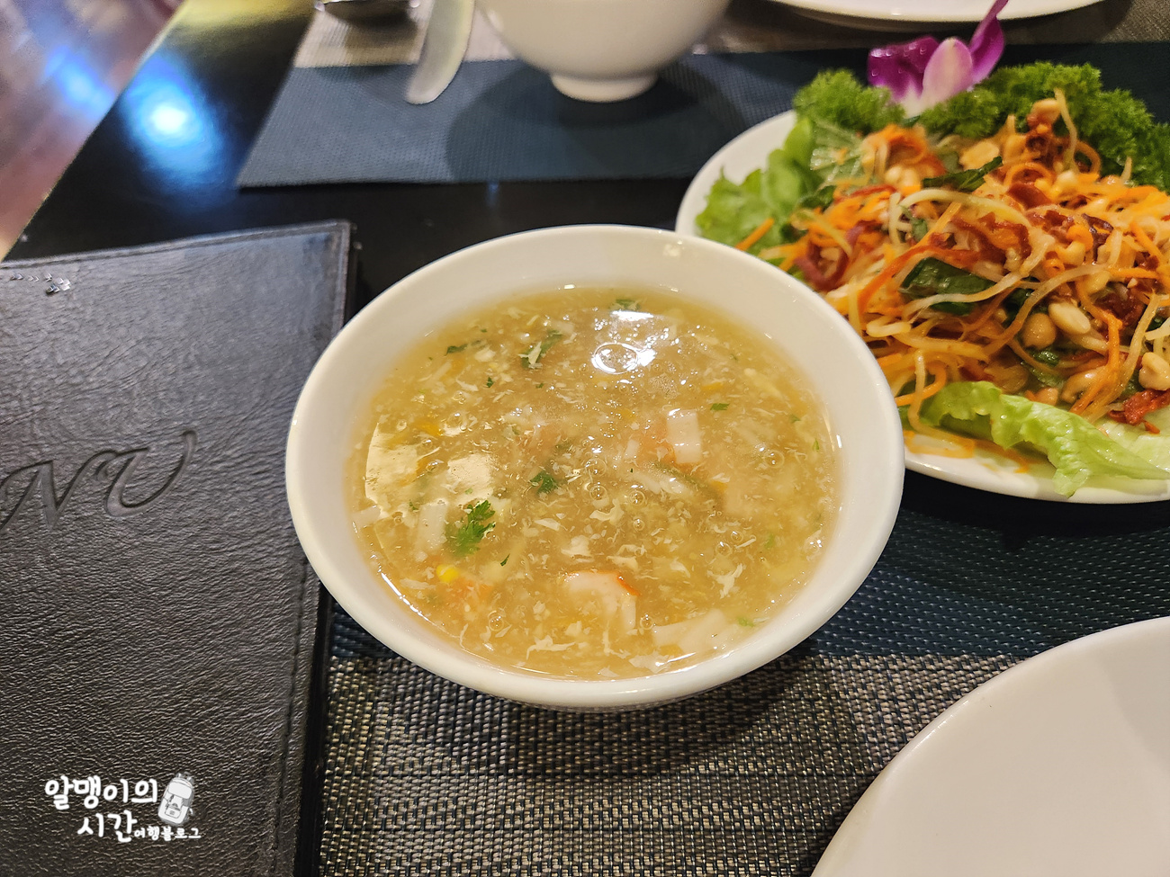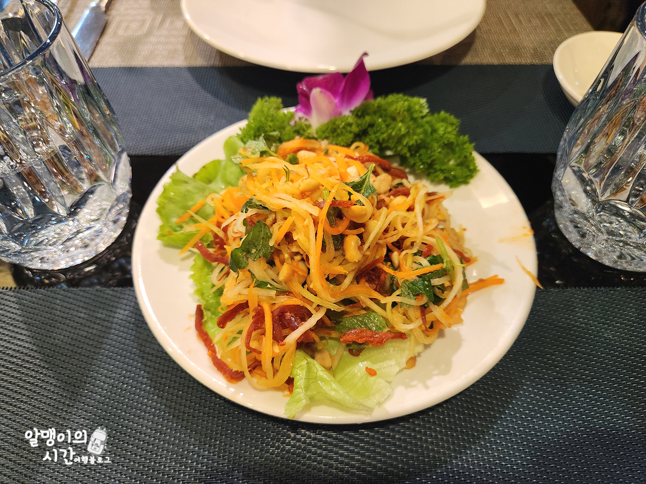 상큼 매콤해서 맛있었던 그린 파파야&육포 샐러드. 게살 스프도 맛있었어요.