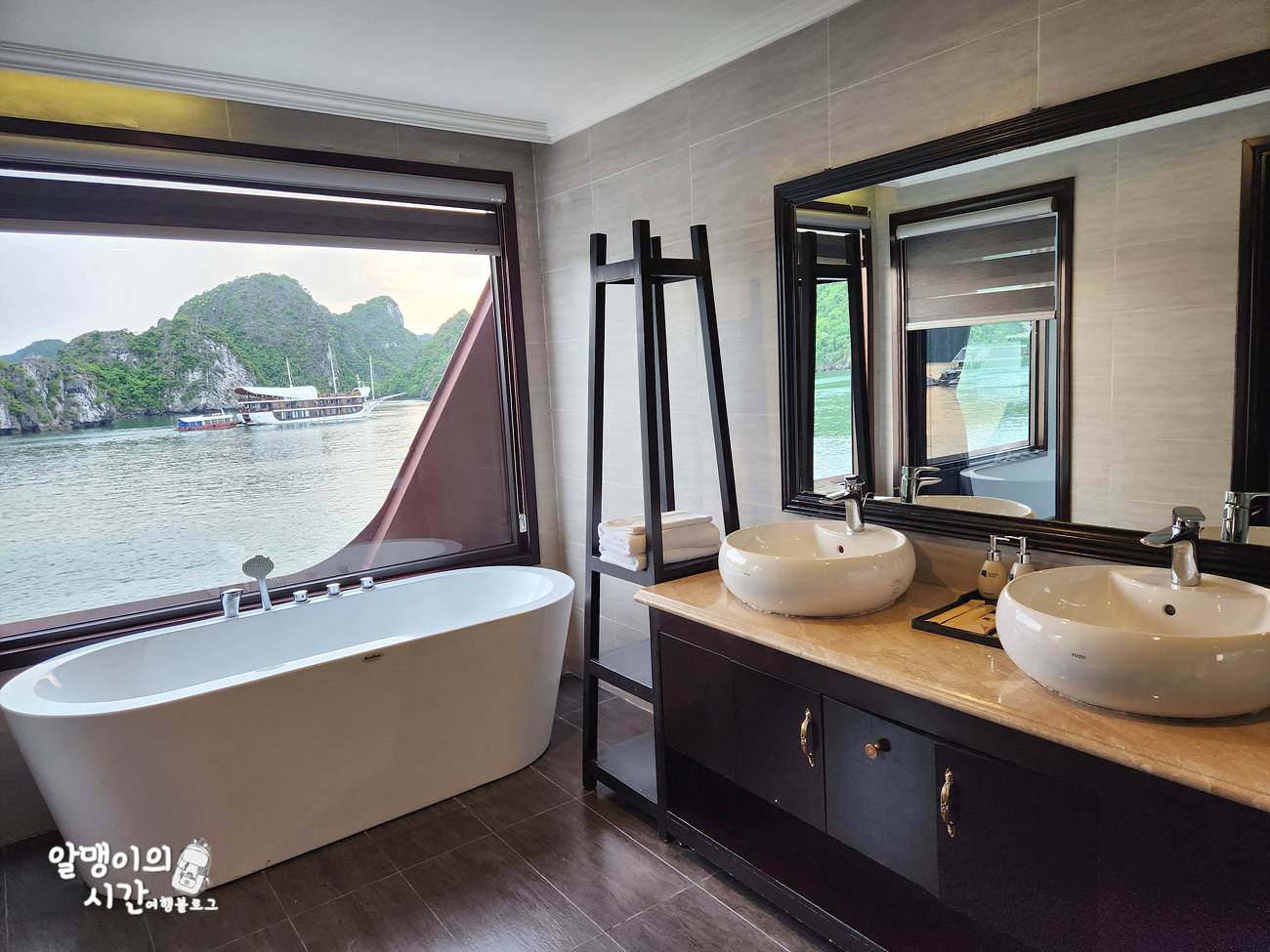 침실도 침실인데 화장실 분위기 미쳤죠 ㅠㅠ 화장실에서도 하롱베이 뷰를 놓치지 마세요ㅋㅋㅋ 욕조뿐만 아니라 센스 있게 샤워부스도 있어서 실용성까지 챙기는 화장실. 화장실이 매우 커요.